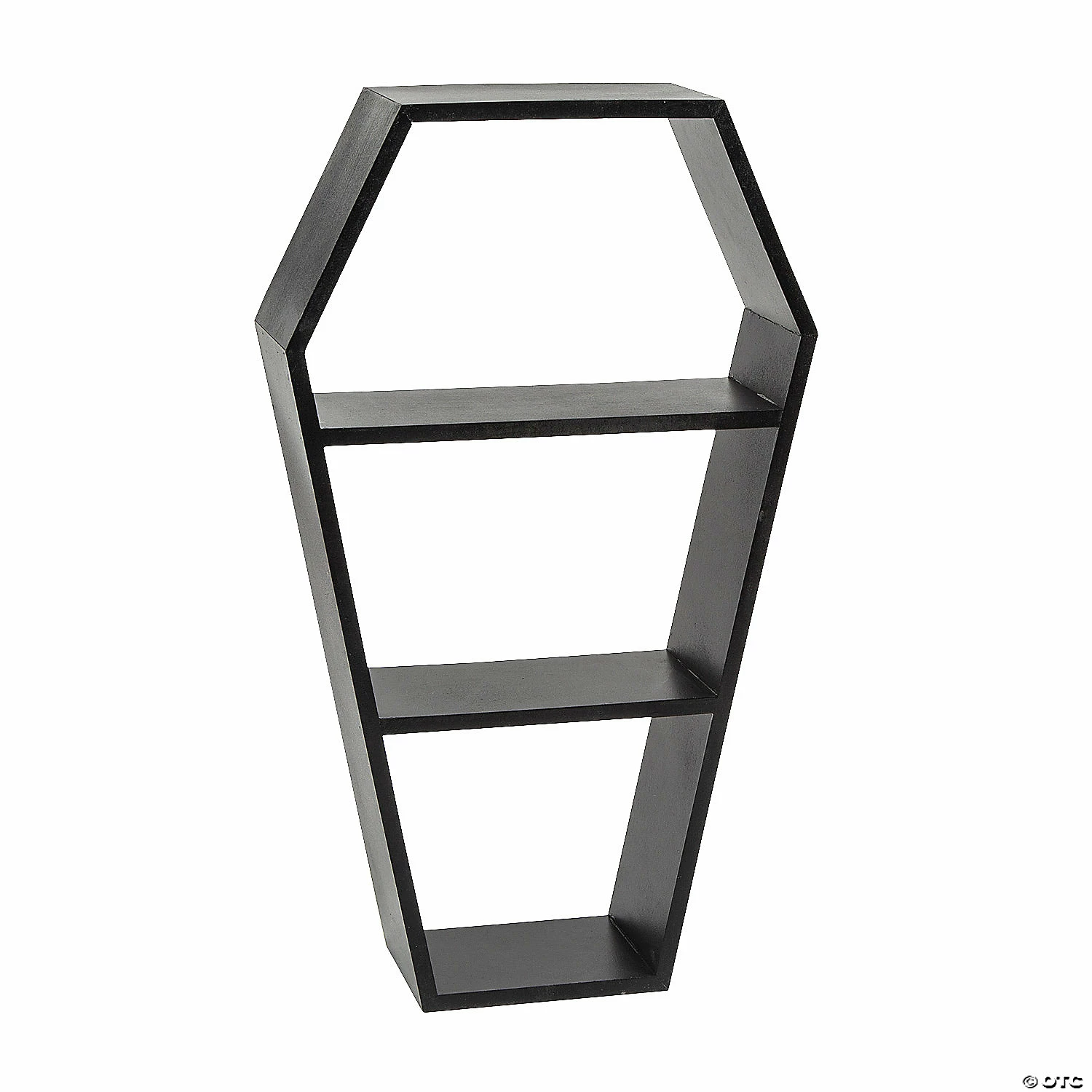 This coffin-shaped shelf adds an eerie atmosphere to Halloween displays. Set up this Halloween themed shelf and use it as the perfect way to display your small Halloween decorations. Make it look even spookier by covering it with spider webs and creepy spiders (sold separately). Wood. 10 1/2″ x 3 1/2″ x 18″ Β© OTC
