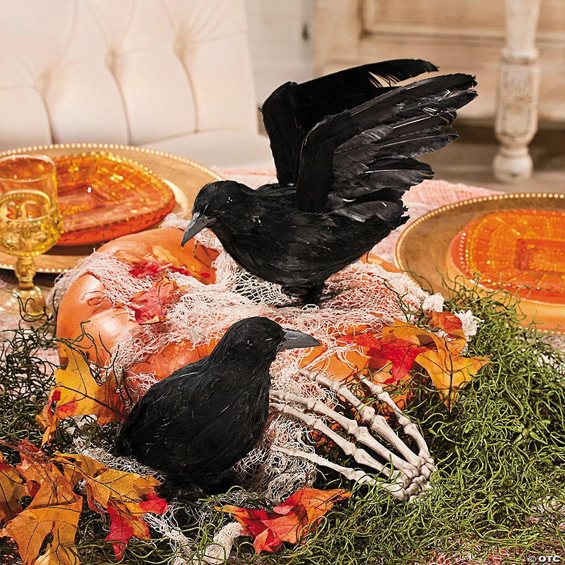 Pop these Halloween props into your party centerpieces, place them on jack-o’-lanterns or perch them on your chandelier. They’re Halloween decorations that add classic, gothic mystery to your dΓ©cor. Incredibly versatile and overlaid with genuine feathers, these creepy crows look like the real thing as they add a spooky touch to your fright night festivities. Freestanding in 2 poses. (2 pcs. per set) 10″ – 12″