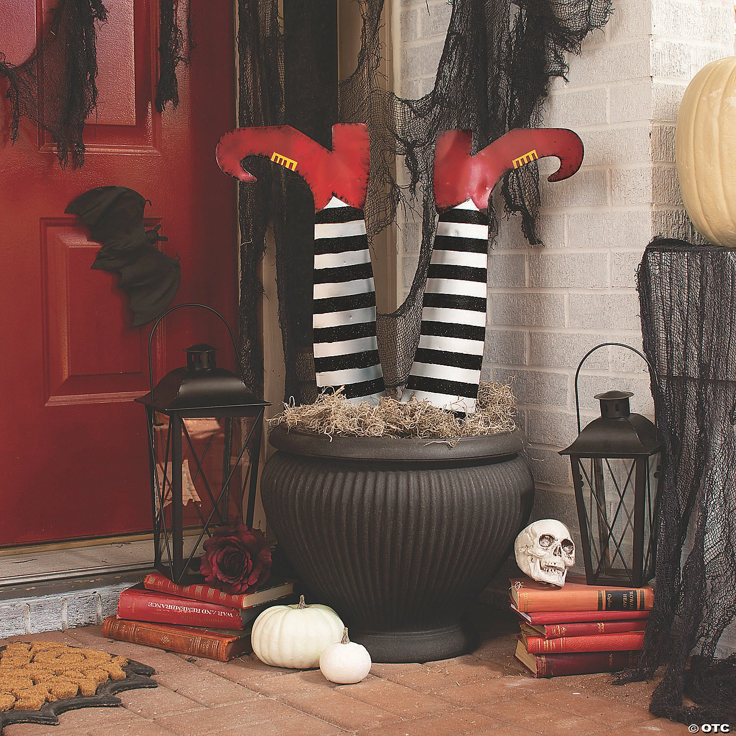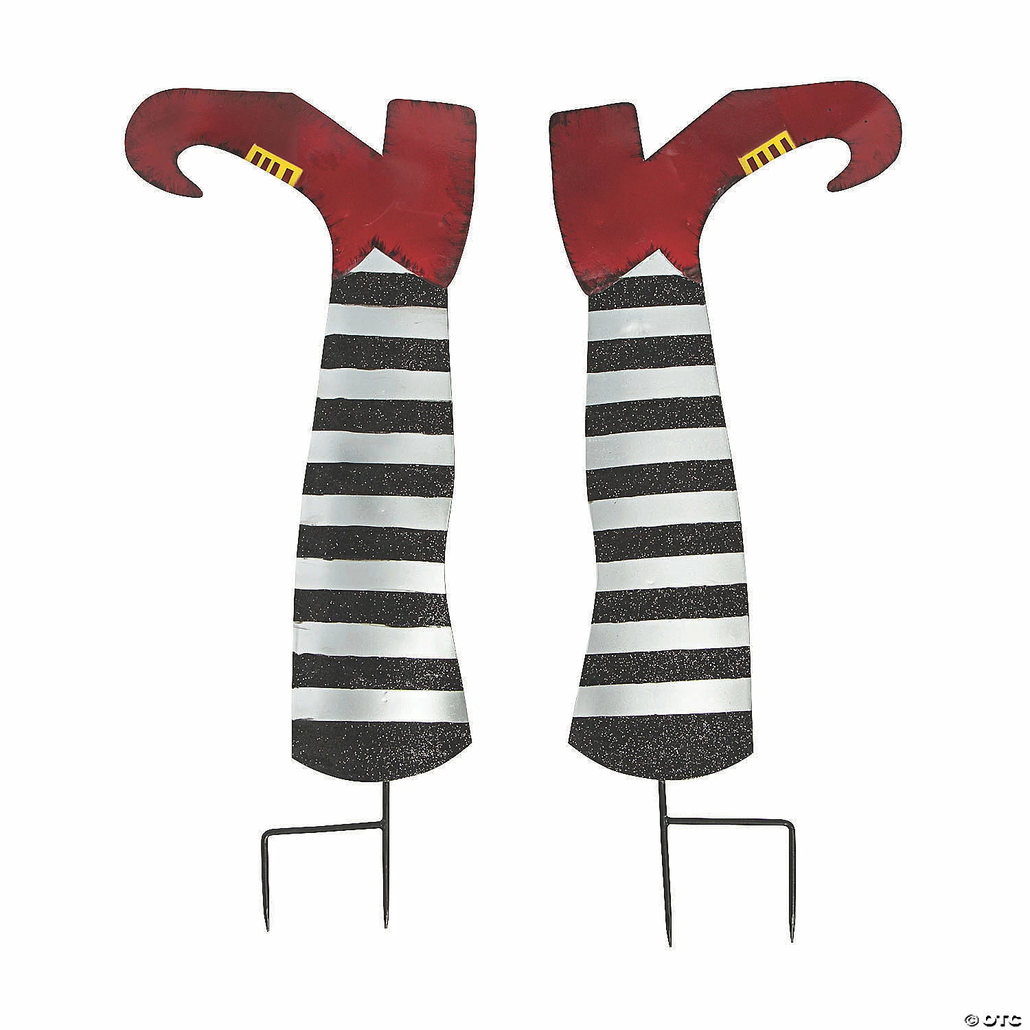 Whizzing through the moonlit sky on her broomstick, this witch took a nosedive and crashed in your front yard! Whimsical and wicked for Halloween dΓ©cor, this outdoor accent comes made to look like witch legs wearing striped stockings. Simply stick in a flower pot or the ground to transform your lawnβno hocus pocus required, promise! Looks like this sorceress wonβt be flying away on her broom anytime soon. Metal. (2 pcs. per set) 13 3/4″ x 24″ © OTC