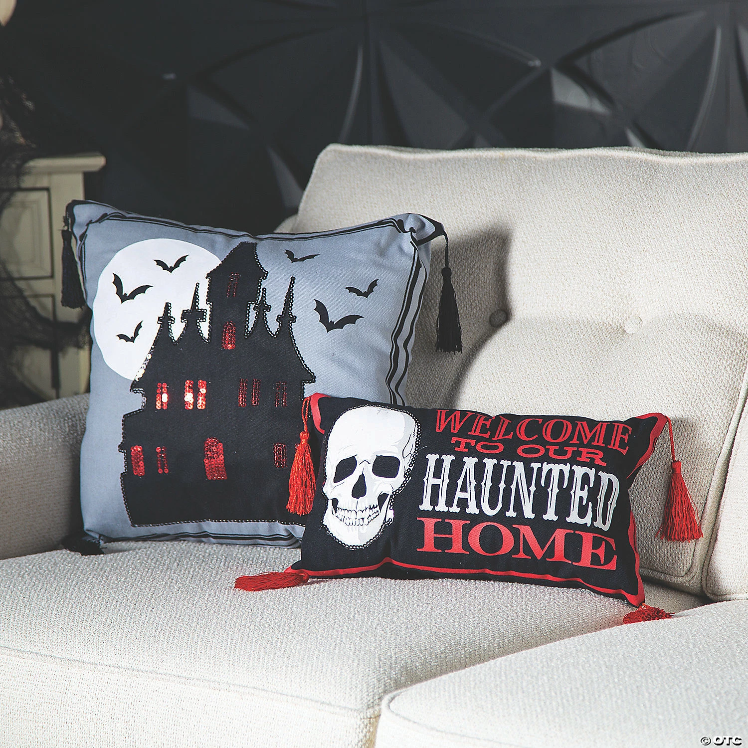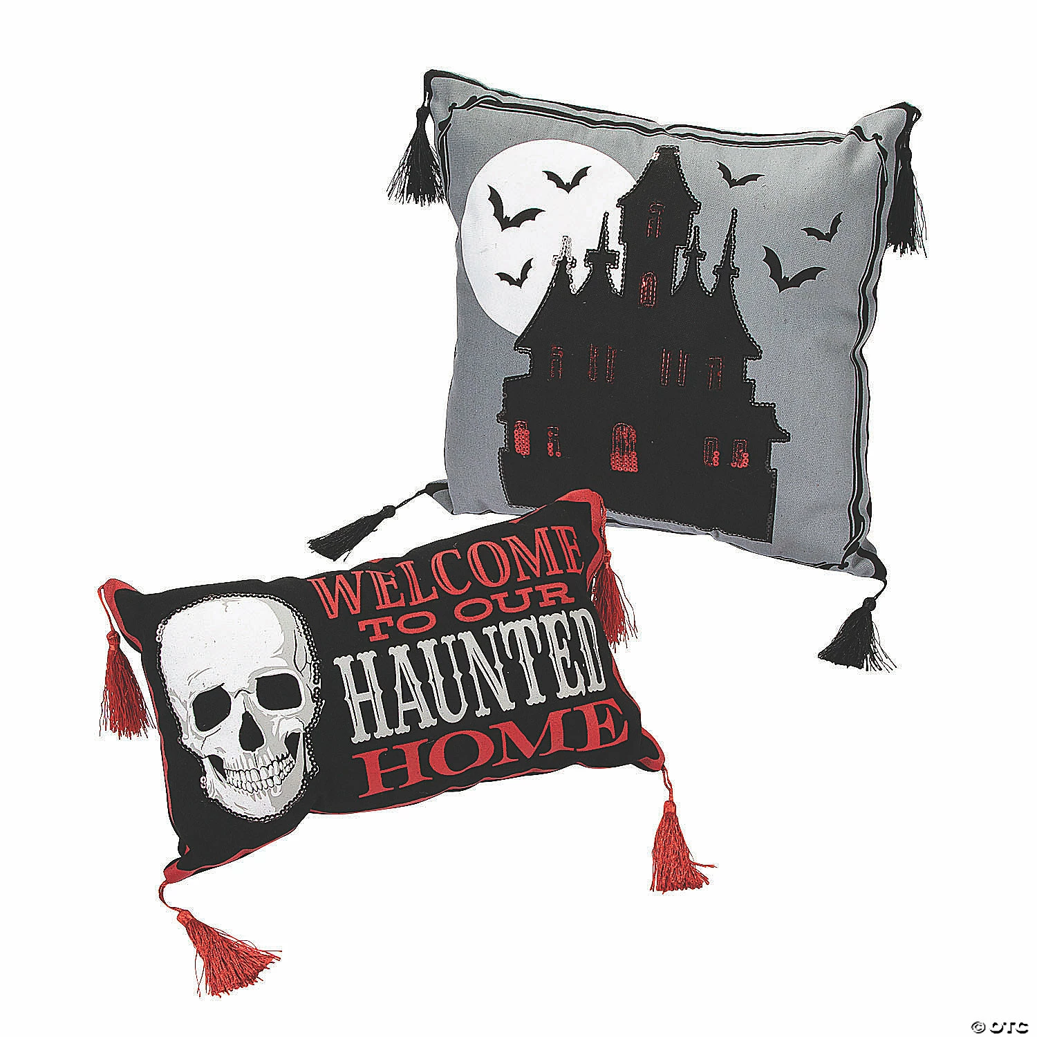 This spooky Halloween addition to home dΓ©cor will make your old throw pillows a little jealous when it comes to changing out your seasonal dΓ©cor. One is printed with, “Welcome to our haunted home” and the other has a design of a haunted house and bats. Poly-cotton. (2 pcs. per set) 14 1/2″ – 16″ x 8 1/2″ – 16″ Imported. Β© OTC