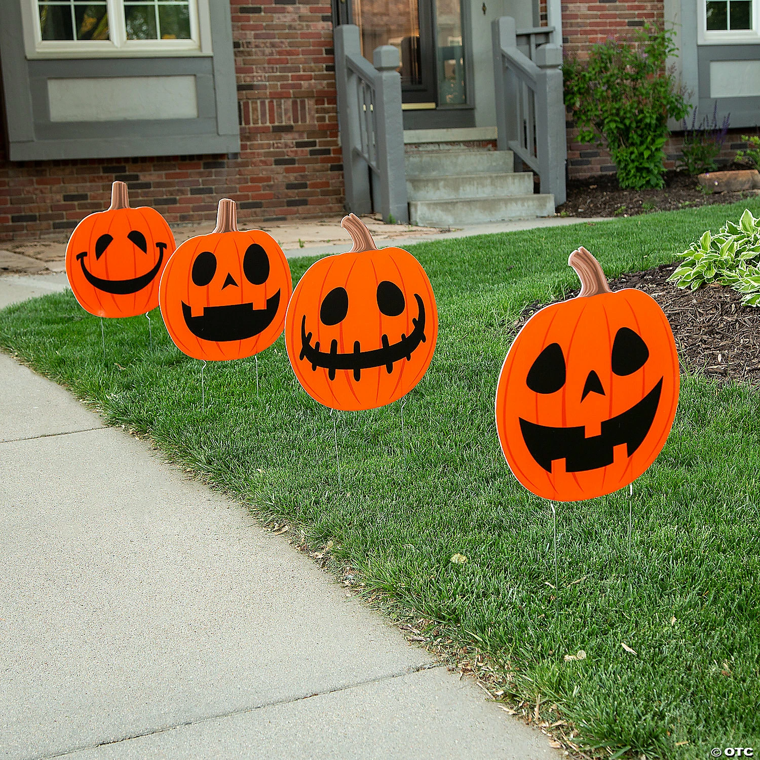 Display some cute jack-o-lanterns that canβt get smashed and wonβt start to decay if left out too long! These adorable yard stakes each look like a smiling, carved pumpkin, making them perfect as Halloween outdoor decorations. Have some classic pumpkin decorations for Halloween with no carving required! Corrugated plastic. (4 pcs. per set) 17″ x 20″ Includes metal stakes. Single-sided. Simple assembly required. Β© OTC