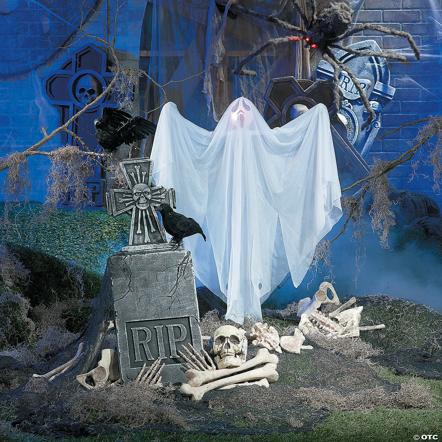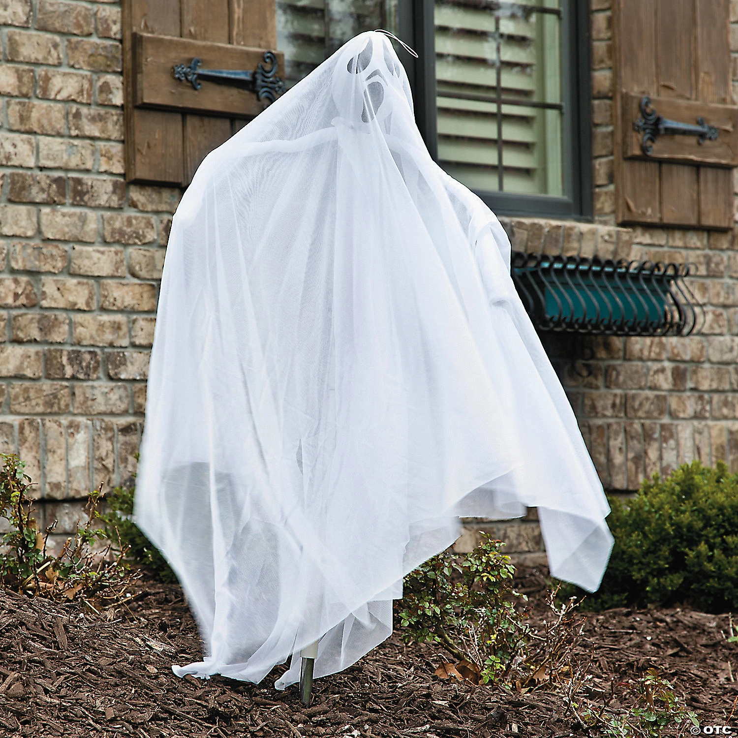 A colorfully-chilling Halloween prop! Guide guests to your Halloween party with this fall outdoor dΓ©cor. Sure to add an eerie look to your lawn, this eerie spirit is perfect for greeting trick-or-treaters or decorating the entrance to a haunted house. The head of this traditional white ghost lights up with changing colors. Comes on a 41″ plastic stake with metal base. Batteries included. Simple assembly required.